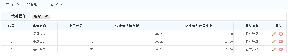 快速消費會員等級信息:快速消費:會員在此等級時,快速消費所能享受的消費折扣.       積分:會員在此等級時,快速消費時自動兌換的積分比率,如:消費10元得1積分|消費20元得1積分|消費50元得1積分。
