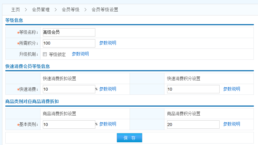 商品類別對應(yīng)商品消費折扣:基本分類:會員在此等級時,商品消費所能享受的消費折扣       積分:會員在此等級時,商品消費時自動兌換的積分比率,如:消費10元得1積分|消費20元得1積分|消費50元得1積分。