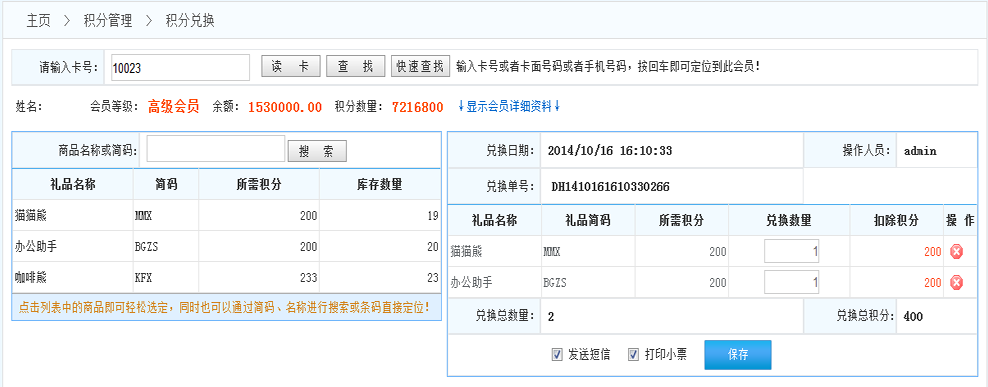 1.發(fā)送短信:如果系統(tǒng)開啟了短信功能,在完成兌換后系統(tǒng)會自動給該會員發(fā)送通知短信,告知會員兌換信息!(開啟短信功能在 增值服務(wù)》服務(wù)參數(shù)》短信參數(shù)設(shè)置(對短信進(jìn)行參數(shù)設(shè)置))