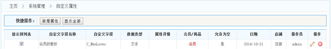 自定義屬性設(shè)置:清除全部數(shù)據(jù)、還原測試:給會員新增自定義屬性字段,可在會員列表體現(xiàn).點擊【顯示全部】自定義字段全部顯示在會員列表中
