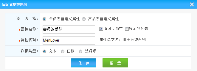 1.屬性類型:選擇自定義屬性類型 是會員屬性還是產(chǎn)品屬性