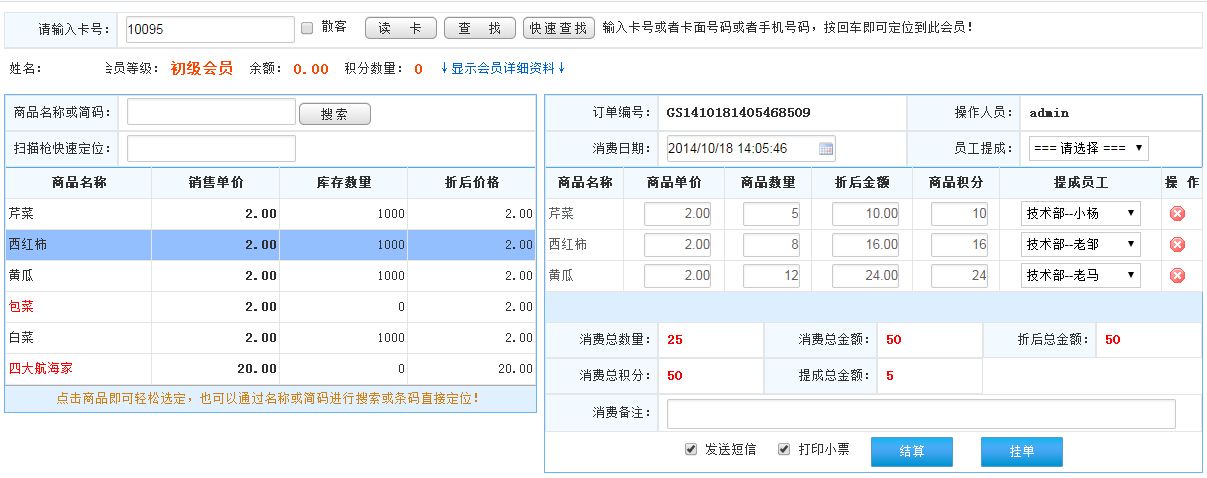先會(huì)員刷卡,然后輸入商品的名稱(chēng)或簡(jiǎn)碼或者掃描槍快速定位查找商品;或者直接點(diǎn)擊商品選擇;選擇商品后點(diǎn)擊結(jié)算此訂單如圖顯示: