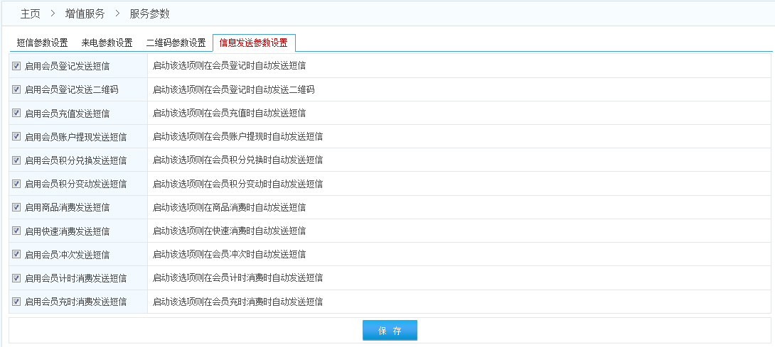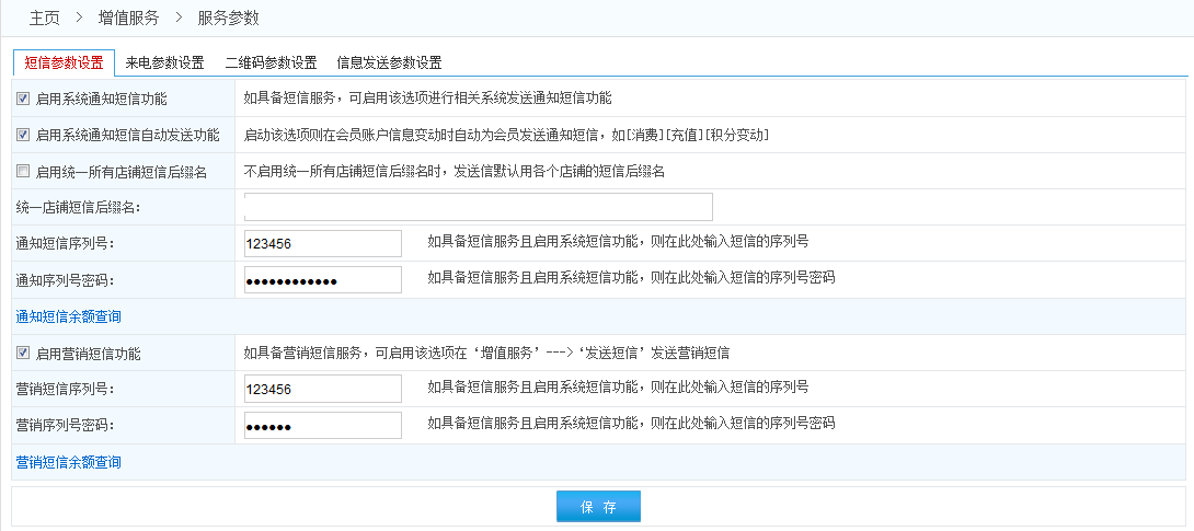 注意: 1.每一個參數對應著系統的一個功能,請務必閱讀完每條參數后面的說明文字后 再開啟或關閉該功能。 2.通知短信是會員在本系統中進行消費充值等操作時給會員發(fā)的提醒短信;營銷短信是為了促銷等目的專門為一個或多個會員發(fā)送的(營銷短信有且只能在發(fā)送短信的頁面發(fā)送)